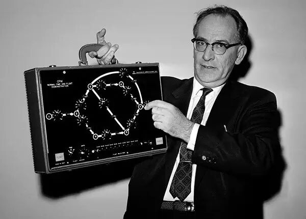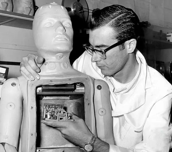 1962年11月2日,华盛顿,约翰·W.莫奇利博士在参加完美国工业工程师协会的一个会议后展示他的古怪发明。