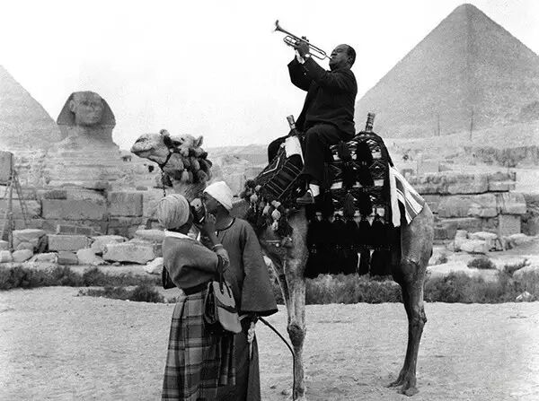 1961年1月28日,埃及开罗,路易斯·阿姆斯壮骑在骆驼上,游览狮身人面像和吉萨大金字塔。