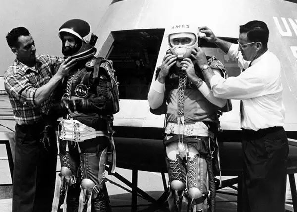 1962年4月6日,美国宇航局宇航员在调整传动装置,为登上阿波罗航天飞机做准备。