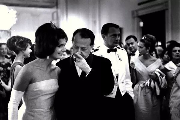 1962年5月11日,华盛顿,第一夫人杰奎琳·肯尼迪陪同主宾法国国家文化部部长安德烈·马尔鲁出席晚宴。