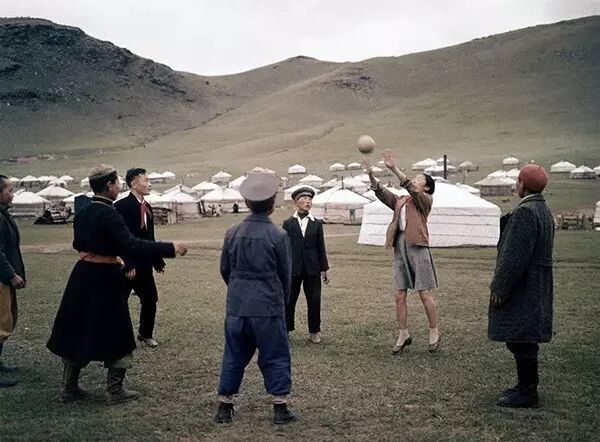 1962年3月,蒙古,青少年在草原上玩排球。