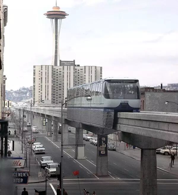 1962年,美国西雅图,太空针塔和单轨铁路,这也是西雅图世博会的一部分。