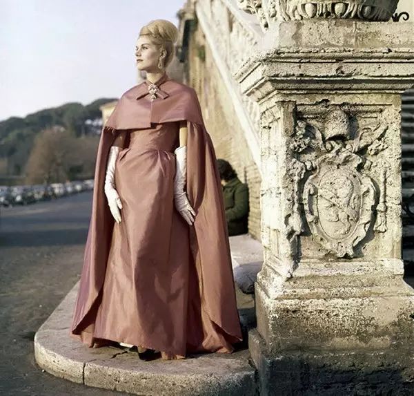 1962年1月11日,意大利的罗马,一个模特穿着产自中国山东的蝉翼纱为原料制作的金棕色的披肩,它的创作者是雷纳托·波尔斯托。