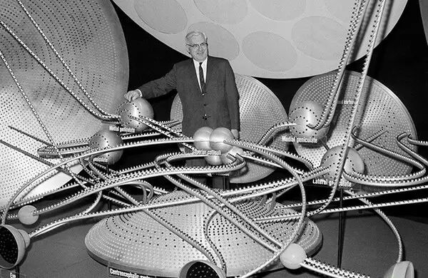 1961年6月26日,纽约,A.G.麦克劳德博士在美国医学协会会议上展示一个巨大的人脑控制系统电气化模型。