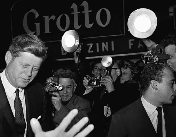 1962年1月19日,纽约,肯尼迪总统出席在第46街剧院上演的百老汇戏剧“如何在商业上不认真努力就能成功”的活动,被记者们追相拍摄。