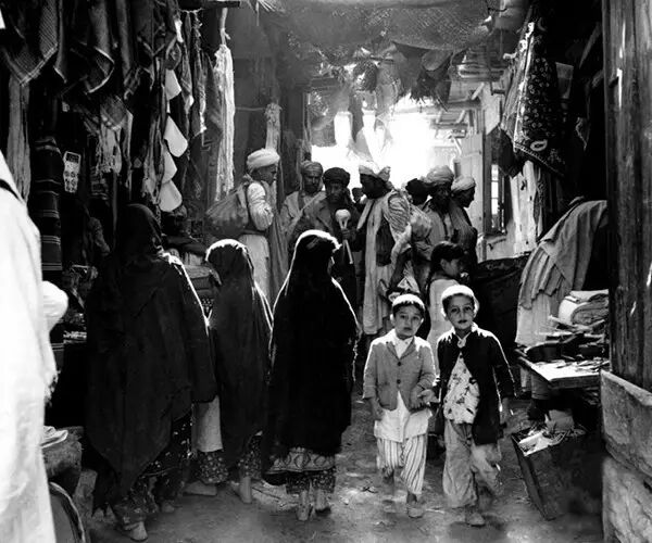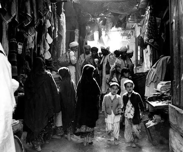 1964年5月,阿富汗首都喀布尔,一个市场里的男人、女人和男孩。