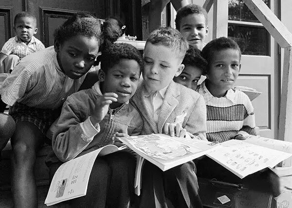 1961年9月19日,纽约奥尔巴尼的圣菲使徒学校,8岁的三年级小学生比尔·斯坦利与黑人同学们在一起看书。