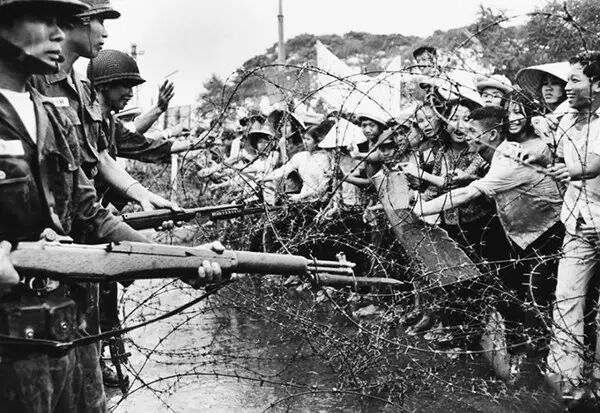 1964年,南越军人用刺刀对着抗议者,阻止他们越界。