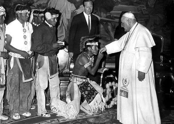 1961年5月16日,意大利梵蒂冈,一名美洲阿帕契人跪在地上,亲教皇约翰二十三世的手。