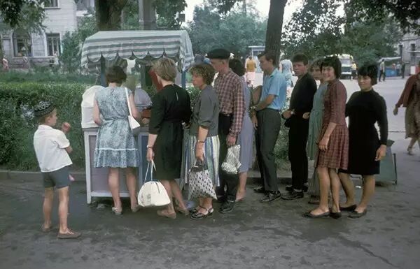 1964年, 苏联哈巴罗夫斯克,排队买冰淇淋的人群。哈里森·福尔曼/摄。