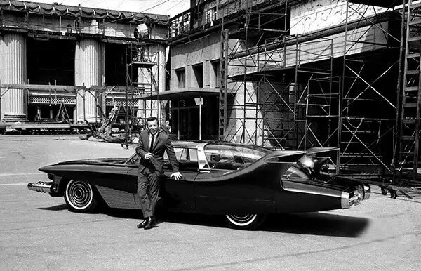 1961年3月31日,加利福尼亚州好莱坞,歌手博比·达林站在手工打造的“梦想汽车”旁拍照留念。