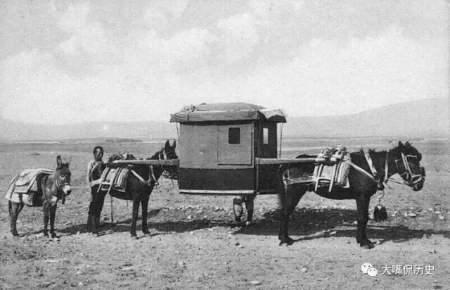 15、1900年晚清时候的骡子抬轿。按俩轮子拉着走多好,为什么非要抬着呢?