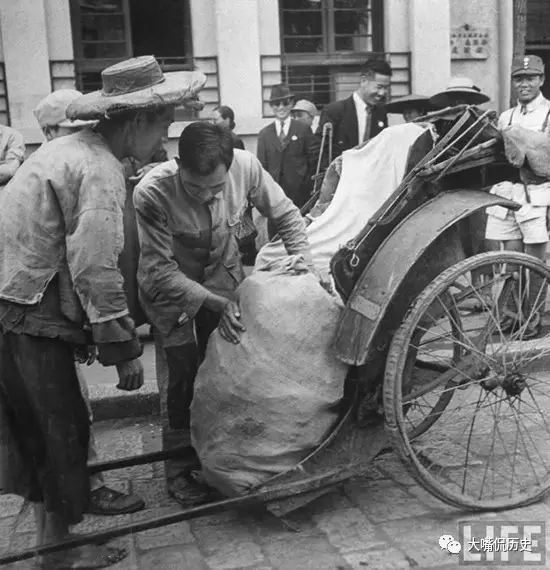 27、1945年战后通货膨胀,钱不值钱了,常常买东西要装一麻袋钱才行。