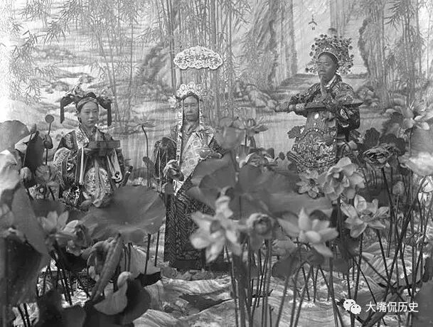 2、慈禧当老佛爷成瘾,硬要扮成观音菩萨。左边是德龄,右边的“护法”是大太监李莲英。