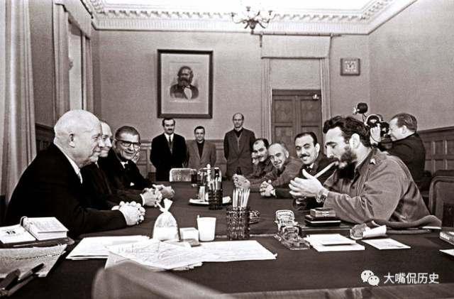 31、1963年,卡斯特罗和赫鲁晓夫会谈。卡斯特罗抽着雪茄,戴着劳力士手表,赫鲁晓夫看着他一脸慈祥。气氛有点暧昧啊……