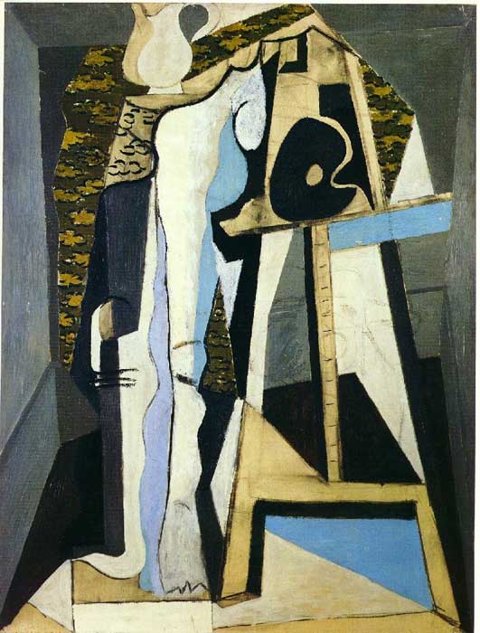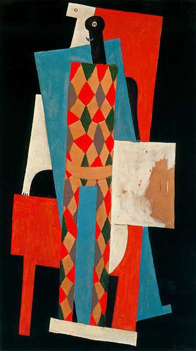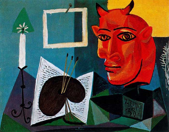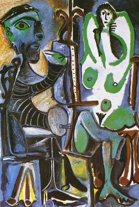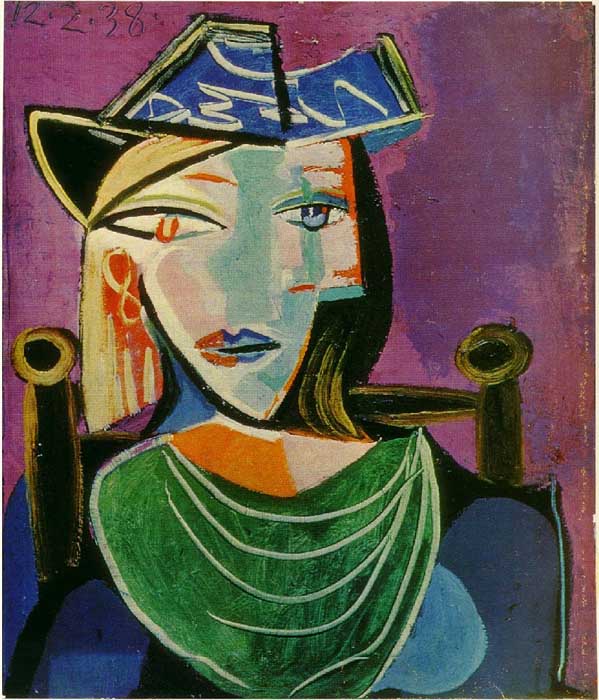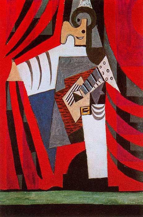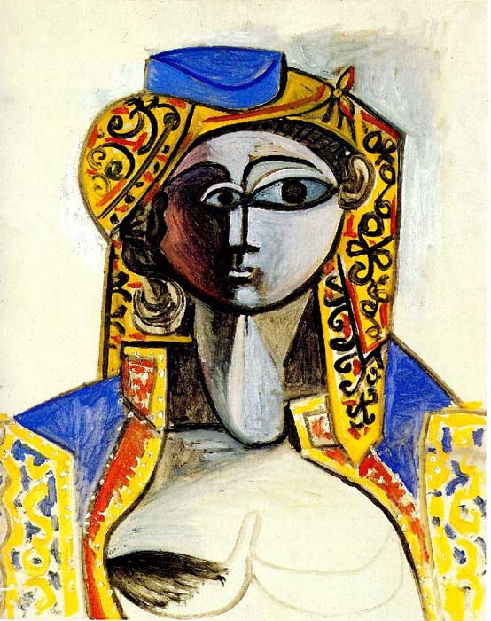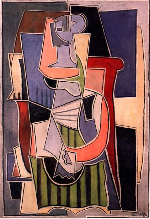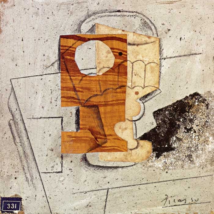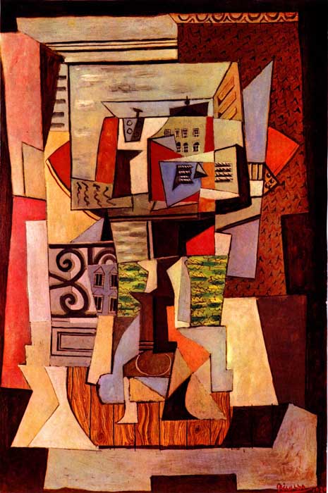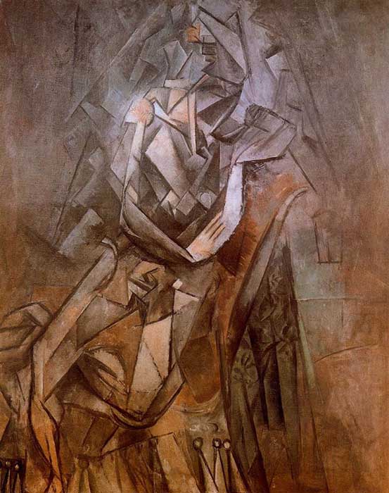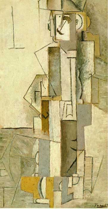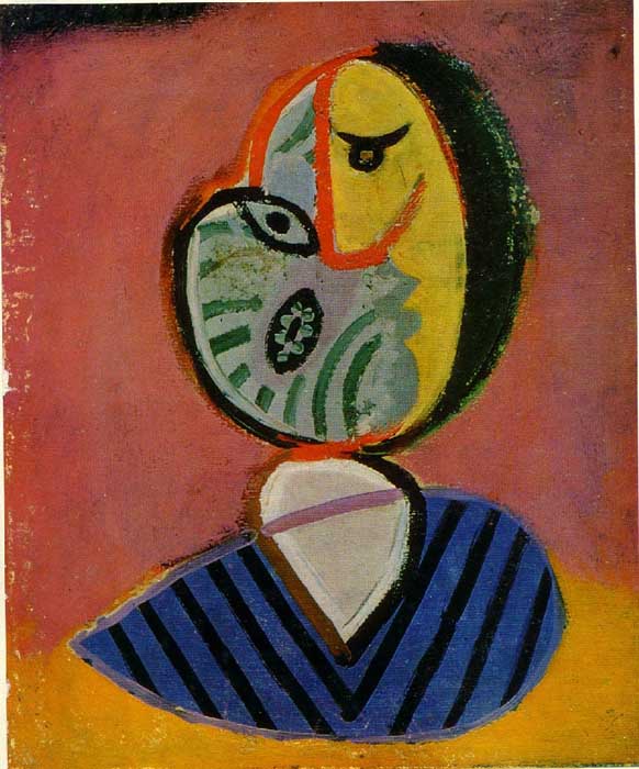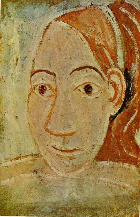 1906年,毕加索结识了马蒂斯。他从这位野兽派泰斗那里发现了黑人雕刻,从此迷上了黑人雕刻,并吸收其艺术精华融入自己的作品中去。这年,毕加索将调色板上的胭脂洗掉,换上灰褐色的颜料,为美国女作家斯坦因画肖像。这幅《斯坦因画像》,是毕加索从玫瑰红时期跃入立体主义时期的跳板,即受到原始艺术的影响,也注意了几何学的基本形,画中的手是写实的,而脸却似土著面具式的形象。