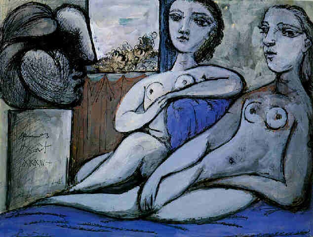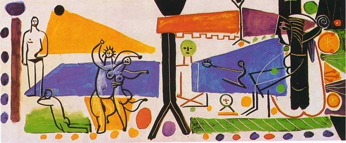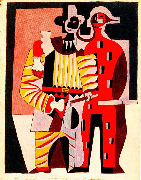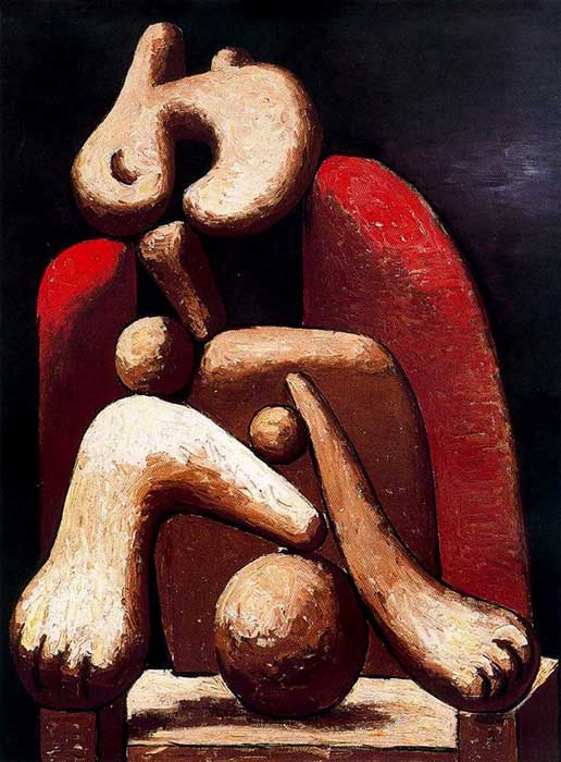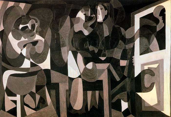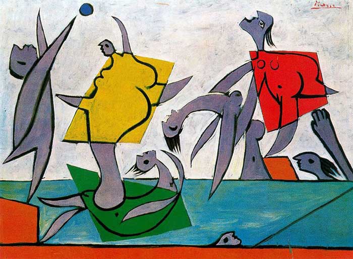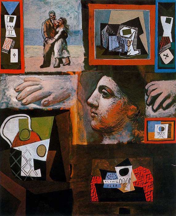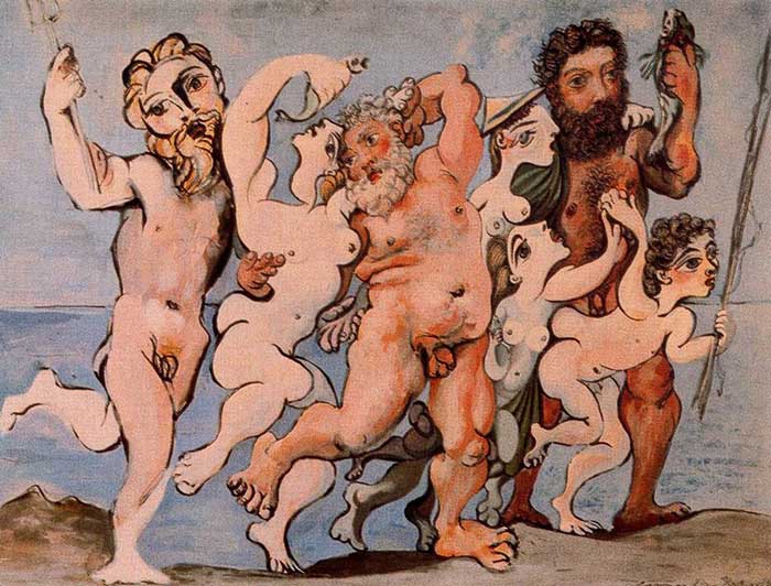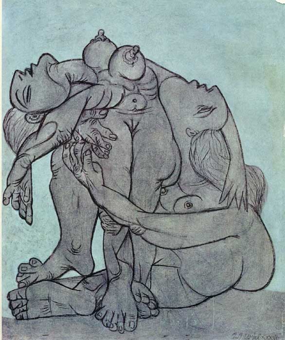 在215CM×143CM的巨幅画面上,毕加索安排了三个舞蹈者,中间一人头部昂起,乳房高耸,双手抬举,表现出一种沉醉和追求。左者露齿狞笑,身躯倾斜;右者扬手踢腿,大部分没入阴影之中,左右两者联手,共同展示出一种即将崩溃的平衡。毕加索把眼睛、胸部、四肢等的位置全都摆乱了,看不到一点推理的因素,眼睛移向头部边缘,那是一只仰视命运的眼睛;连胸脯上都长着一只,那是窥视内心的眼睛,仿佛在倾诉,又仿佛在哭泣。在这里,没有秩序,只有构成。当评论家泰里阿德问毕加索为何要这样画时,毕加索说:“我不是模仿自然,而是面临自然。”那么面临的自然又是什么?当毕加索的妻子奥尔迦变得越来越极端,当她所得到的关心越来越少时,她怒不可遏,朝丈夫发泄。毕加索由生气而愤怒,由愤怒而狂暴,由此而诞生了《舞女(三个舞者)》,当然只是诱因之一。毕加索有过自我评价,说自己的画“一半是上帝,一半是魔鬼”,那么这幅作品属于哪个一半呢?作背景看,另一个诱因,来自超现实主义运动,这项文学、文化运动从1924年起有如汹涌潮水一般。超现实主义宣称:“美是痊孪病态的”战争后遗症,绘画艺术亦不例外。