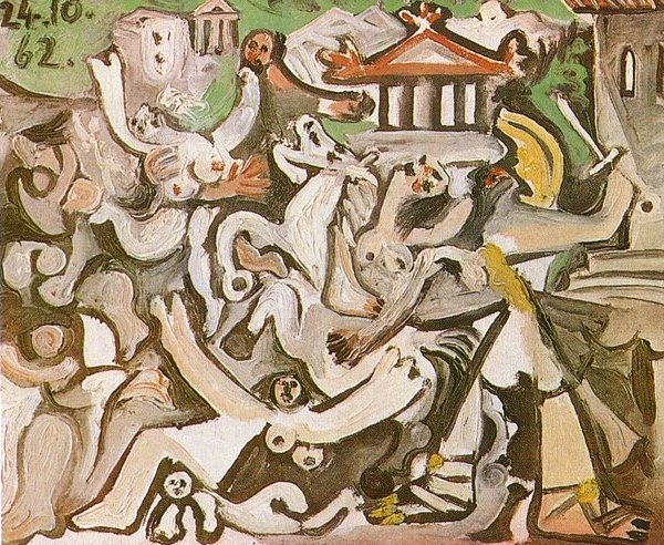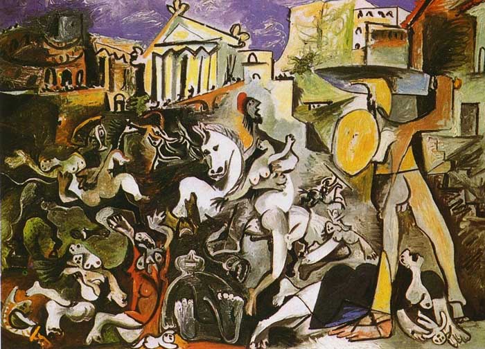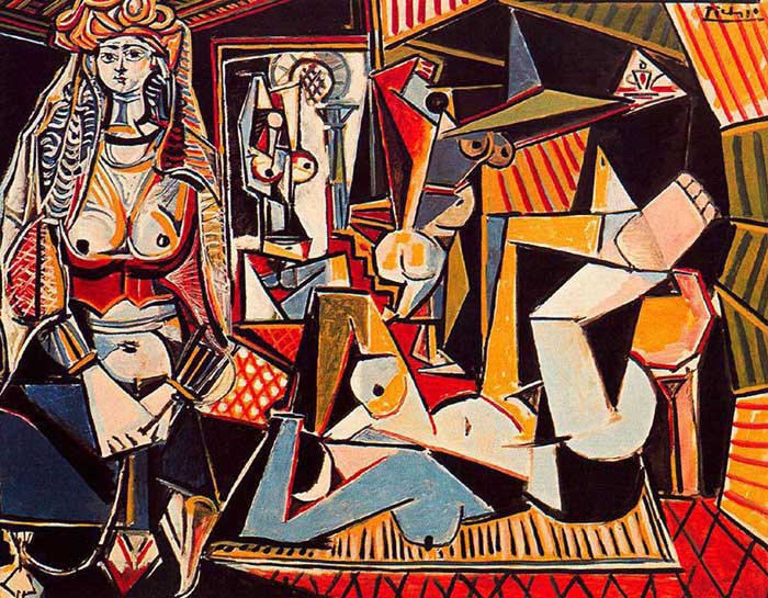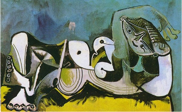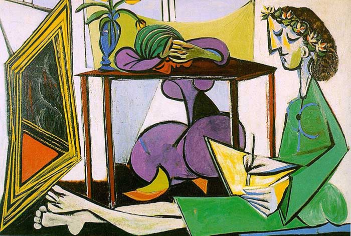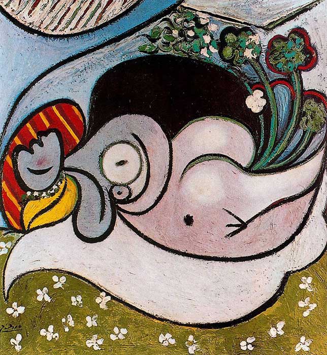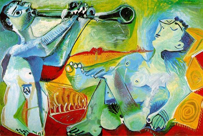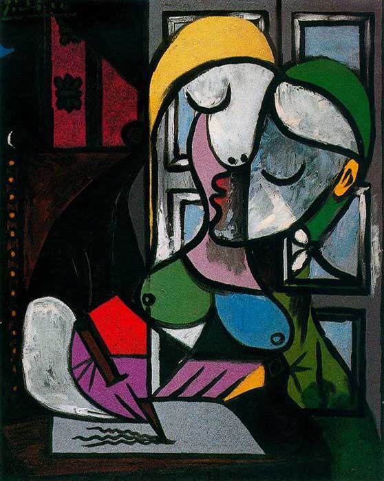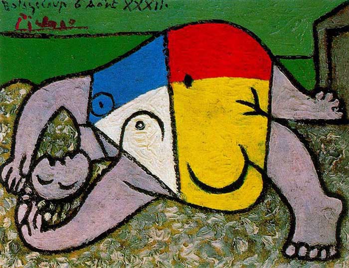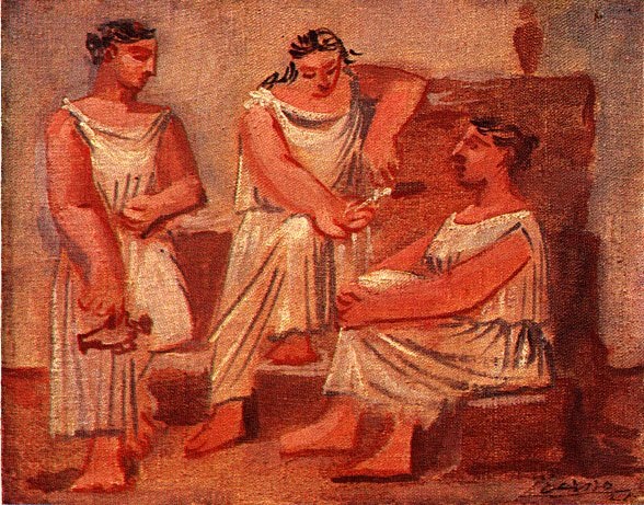在215CM×143CM的巨幅画面上,毕加索安排了三个舞蹈者,中间一人头部昂起,乳房高耸,双手抬举,表现出一种沉醉和追求。左者露齿狞笑,身躯倾斜;右者扬手踢腿,大部分没入阴影之中,左右两者联手,共同展示出一种即将崩溃的平衡。毕加索把眼睛、胸部、四肢等的位置全都摆乱了,看不到一点推理的因素,眼睛移向头部边缘,那是一只仰视命运的眼睛;连胸脯上都长着一只,那是窥视内心的眼睛,仿佛在倾诉,又仿佛在哭泣。在这里,没有秩序,只有构成。当评论家泰里阿德问毕加索为何要这样画时,毕加索说:“我不是模仿自然,而是面临自然。”那么面临的自然又是什么?当毕加索的妻子奥尔迦变得越来越极端,当她所得到的关心越来越少时,她怒不可遏,朝丈夫发泄。毕加索由生气而愤怒,由愤怒而狂暴,由此而诞生了《舞女(三个舞者)》,当然只是诱因之一。毕加索有过自我评价,说自己的画“一半是上帝,一半是魔鬼”,那么这幅作品属于哪个一半呢?作背景看,另一个诱因,来自超现实主义运动,这项文学、文化运动从1924年起有如汹涌潮水一般。超现实主义宣称:“美是痊孪病态的”战争后遗症,绘画艺术亦不例外。