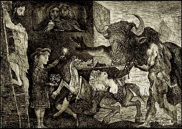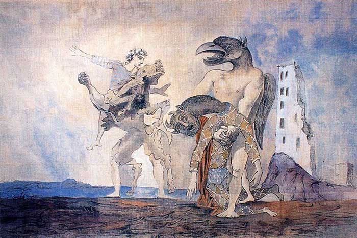 受伤的弥诺陶洛斯(牛头怪)、飞马和人