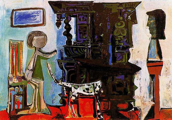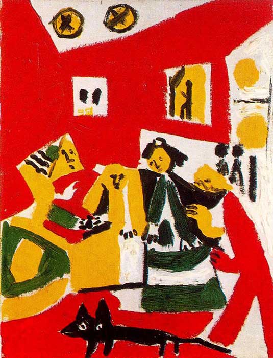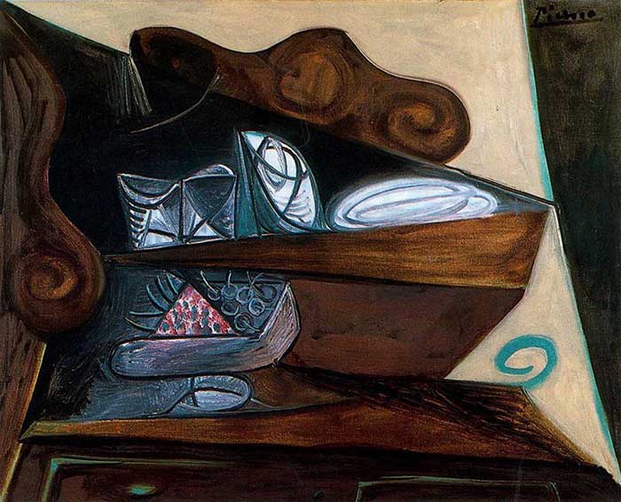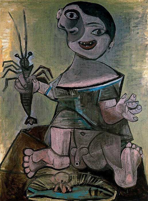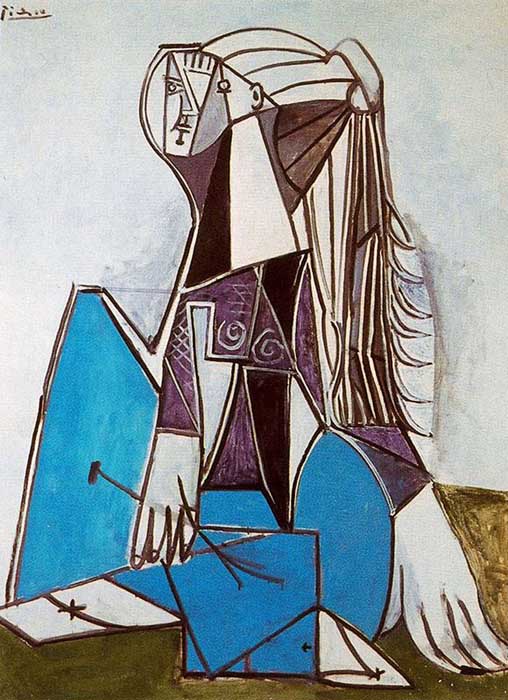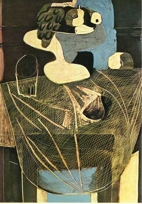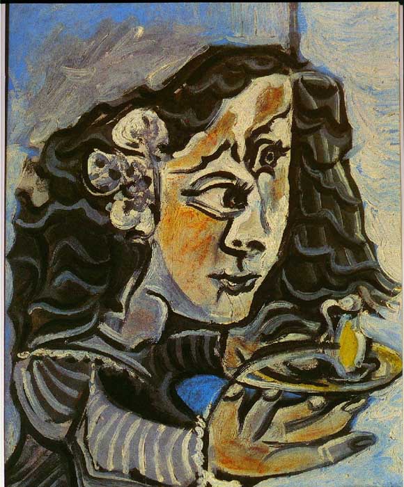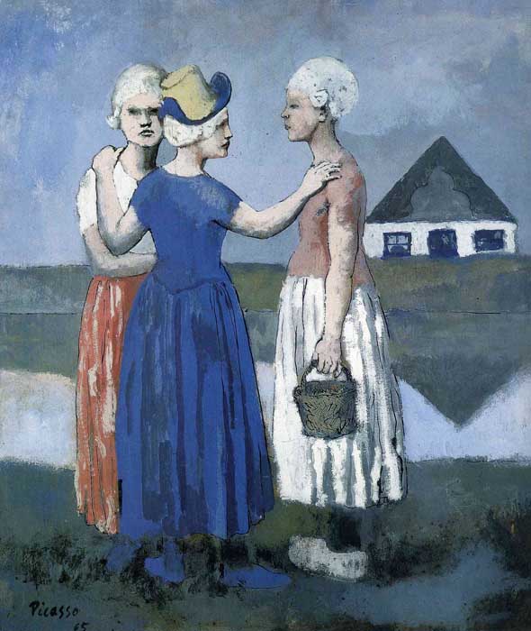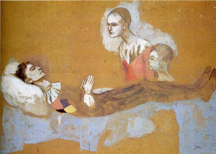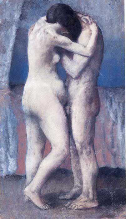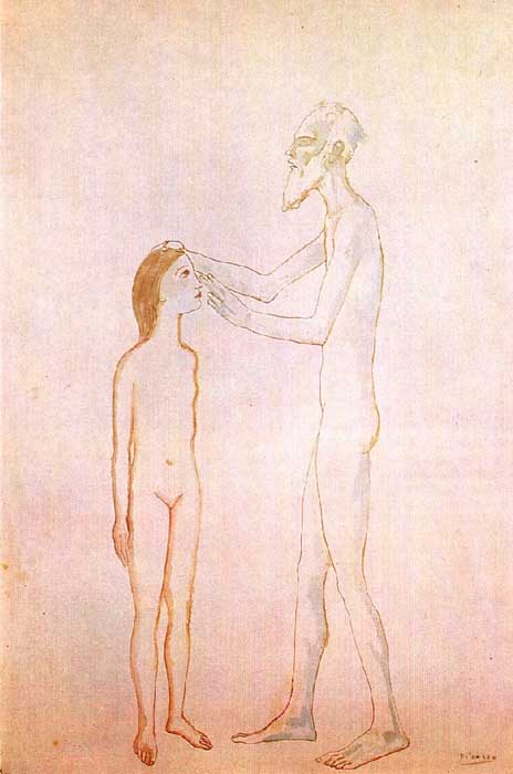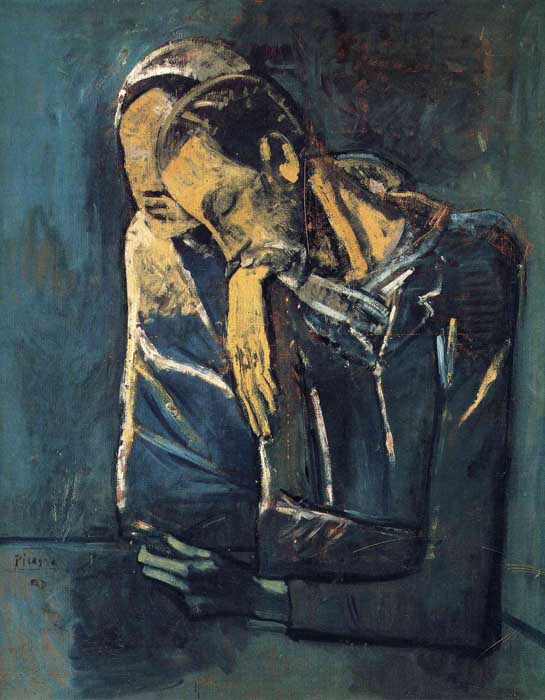 一位盲人坐在桌前,眼窝深陷,毫无生气,枯瘦如柴的手摸索着桌上的水壶和面包。在巴塞罗那期间,毕加索画了一系列关于盲人的作品。盲者最能体现人类的困境 ——盲目的,不仅是看不到光明,而且根本就没有光明的概念。沉于黑暗的深渊,它的尽头依然是黑暗。爱情是盲目的,幸福是盲目的,只有苦难永远睁大着狞厉的眼睛。