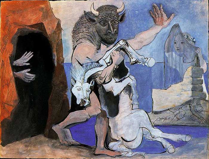山洞前抱着匹死马的弥诺陶洛斯(牛头怪)和披纱巾的少女