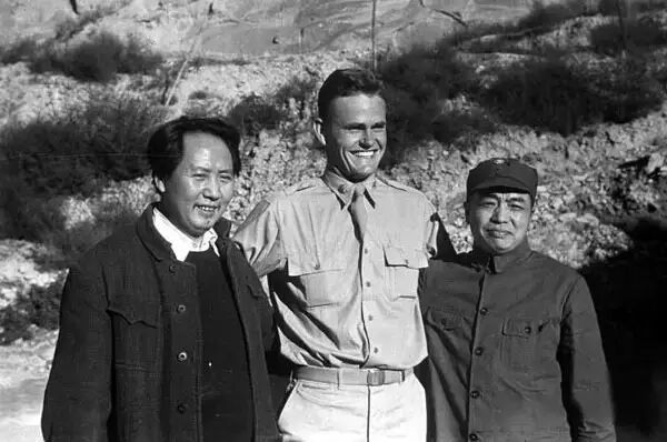 1944年,延安,毛泽东、彭德怀和美国军事人员合影。