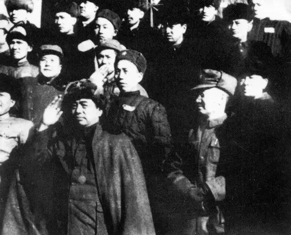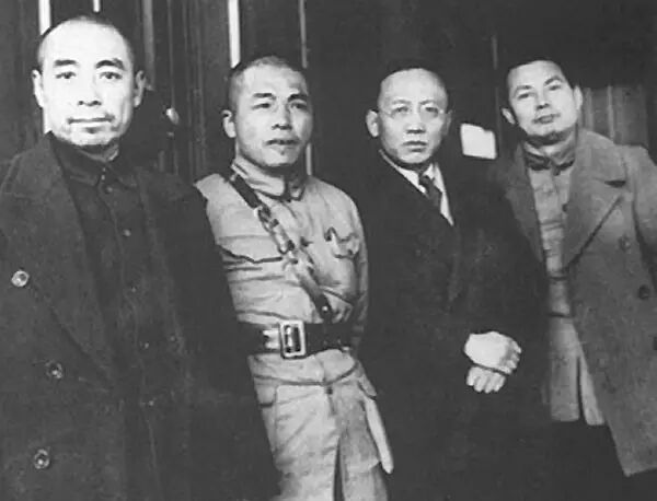 1938年1月,武汉,彭德怀在汉口车站与(左起)周恩来、彭德怀、郭沫若、叶剑英合影。