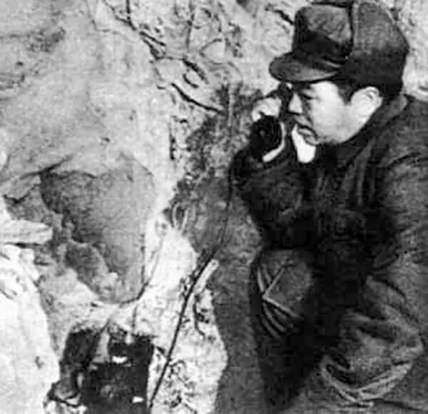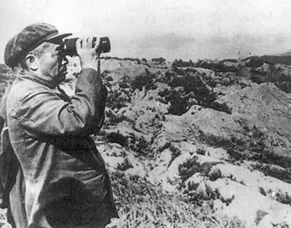 朝鲜战争期间,彭德怀在前线哨所观察。