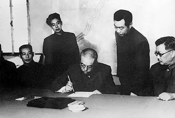 1953年7月28日,朝鲜板门店,中国人民志愿军总司令彭德怀签署停战协议。