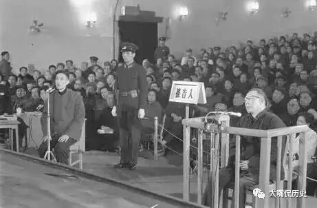 1980年12月4日,特别法庭第一审判庭开庭,对张春桥进行庭审调查。徐景贤(左)就张春桥制造上海康平路武斗事件出庭作证。 (在文革期间徐景贤可是大名鼎鼎,是四人帮的得力干将,在文革期间,张春桥、王洪文调北京,徐景贤称霸上海,红极一时。)
