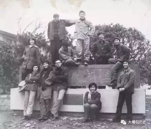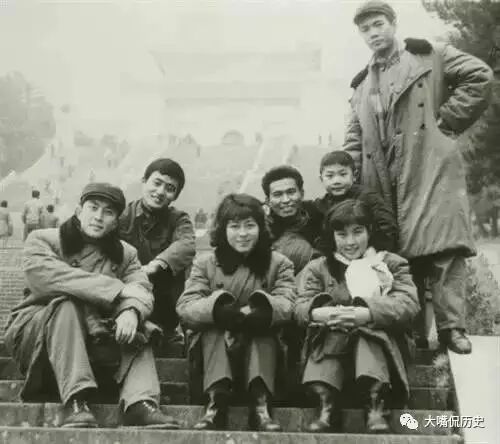 1978年,电影《小花》摄制组成员,背景南京中山陵。左边是唐国强,他是组里公认的完美健康型帅哥,在《小花》中饰演赵永生,右边是刘晓庆,她在影片中演赵永生的妹妹何翠姑,第一排中间是现在影视圈中少有的资深女性制片人李小婉,坐在后面那位瘦瘦的大帅哥就是后来拍出无数优秀电影的导演黄健中,站在后排英武的大男生是当年红遍大江南北的演员李世江。这部《小花》当年火遍全国,有一半国人争先恐后去那些简陋的电影院观看这部影片。