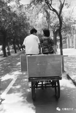 年轻人结婚办理结婚证时,可以领取购买一件家具的票证,凭票证领号排一夜的队,就可以买到一件家具。这是一对新婚夫妇买到家具回家的情景。