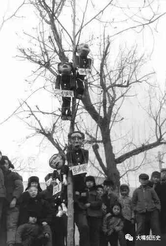 1977年1月,在北京东长安街青年艺术剧院剧场前(位置在现东方广场正中)挂出的“四人帮玩偶”。