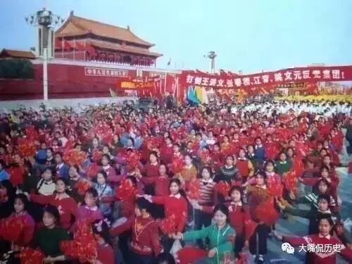 1976年10月24日,北京市人民庆祝华国锋同志任中共中央主席、中央军委主席,庆祝粉碎“四人帮”伟大胜利的游行队伍经过天安门。