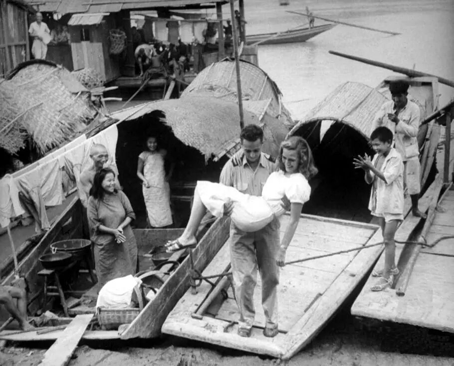 1945年10月,重庆,帕霍伊特抱着女友从舢板船上上岸。杰克·威尔克斯/摄。