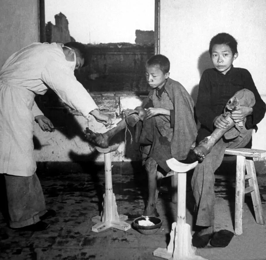 1945年,湖南衡阳,医生给两个少年患溃疡疮口的腿治疗。杰克·威尔克斯/摄。