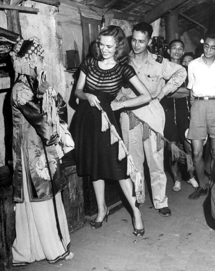 1945年10月,重庆,戏剧女演员教授巴巴拉·斯蒂芬斯中国古典戏剧中如何表演骑马的动作。杰克·威尔克斯/摄。