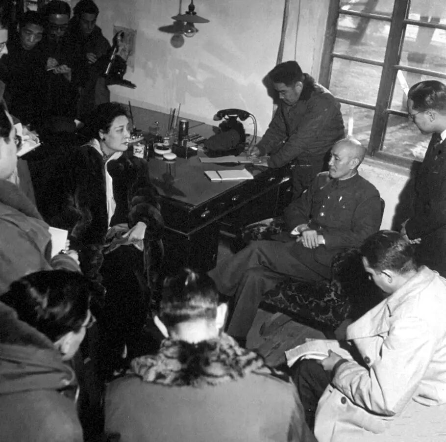 1945年12月,北平南苑机场,蒋介石和宋美龄离开北平时接受记者采访。杰克·威尔克斯/摄。