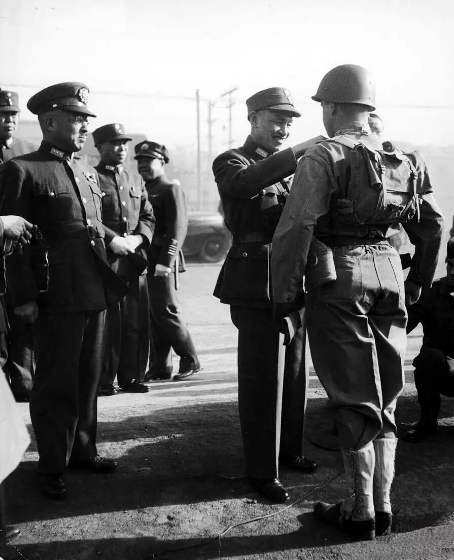 1945年12月,北平,蒋介石为一位士兵整理衣装。杰克·威尔克斯/摄。