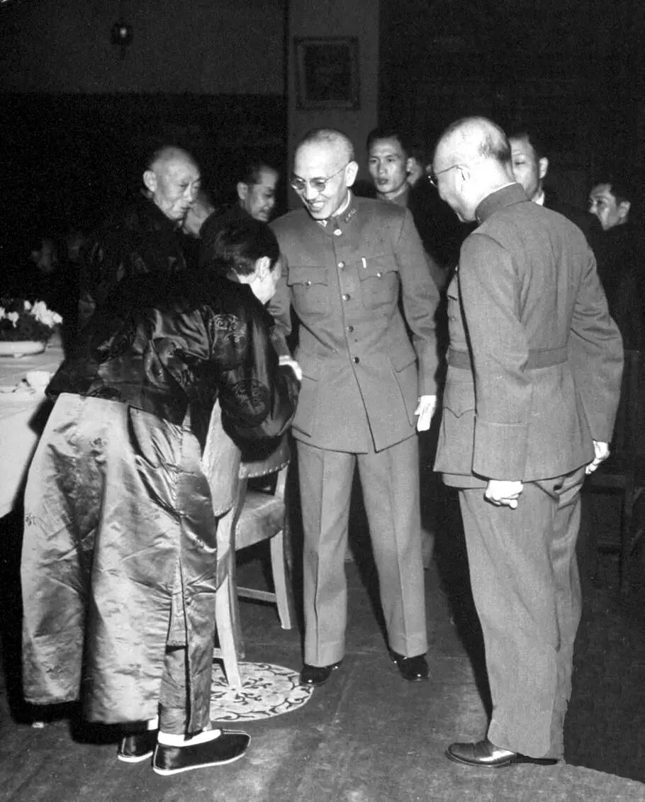 1945年12月,北平,蒋介石和一个谦卑鞠躬者握手。杰克·威尔克斯/摄。