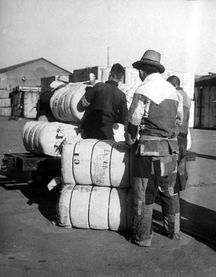 1945年,码头上,一名浑身打满布丁的男子在搬运货物。杰克·威尔克斯/摄。
