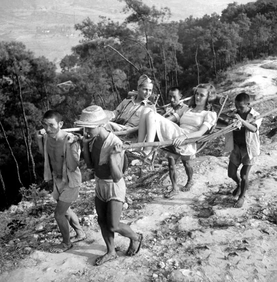 1945年10月,重庆,帕霍伊特和女友乘坐滑竿出游。杰克·威尔克斯/摄。