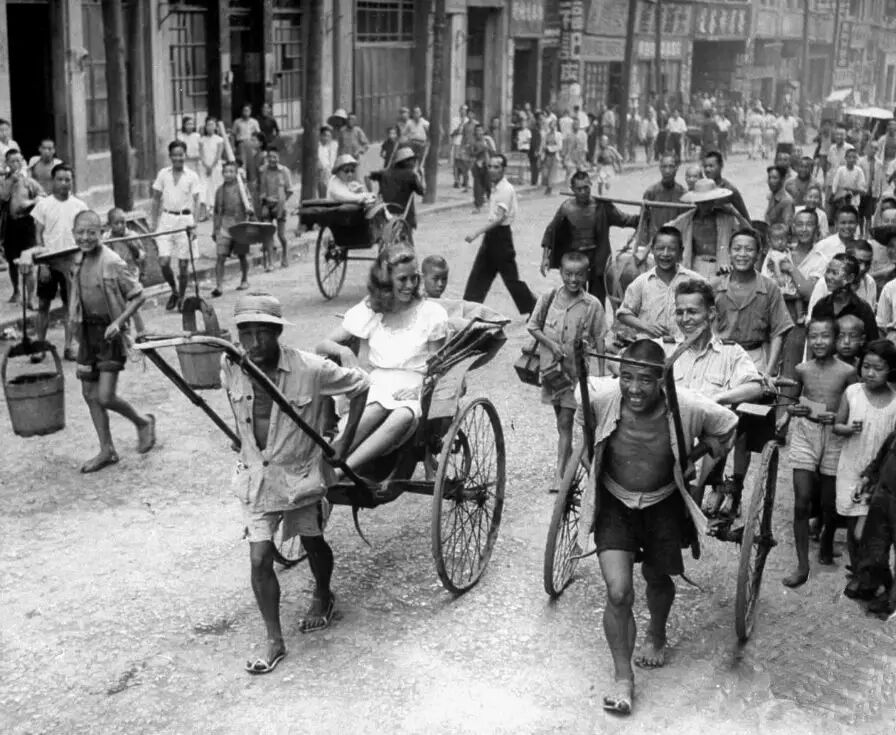 1945年10月,重庆,帕霍伊特和他的女友一起乘坐人力车出游。杰克·威尔克斯/摄。