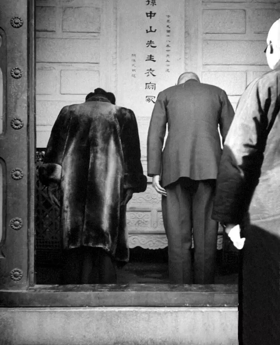 1945年12月,北平,蒋介石和宋美龄在碧云寺拜祭孙中山衣冠冢。杰克·威尔克斯/摄。