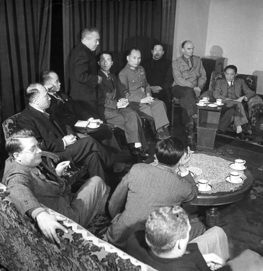 1945年,天津, 联合国和中国官员会面,讨论遭受空袭城市的重建需求。杰克·威尔克斯/摄。