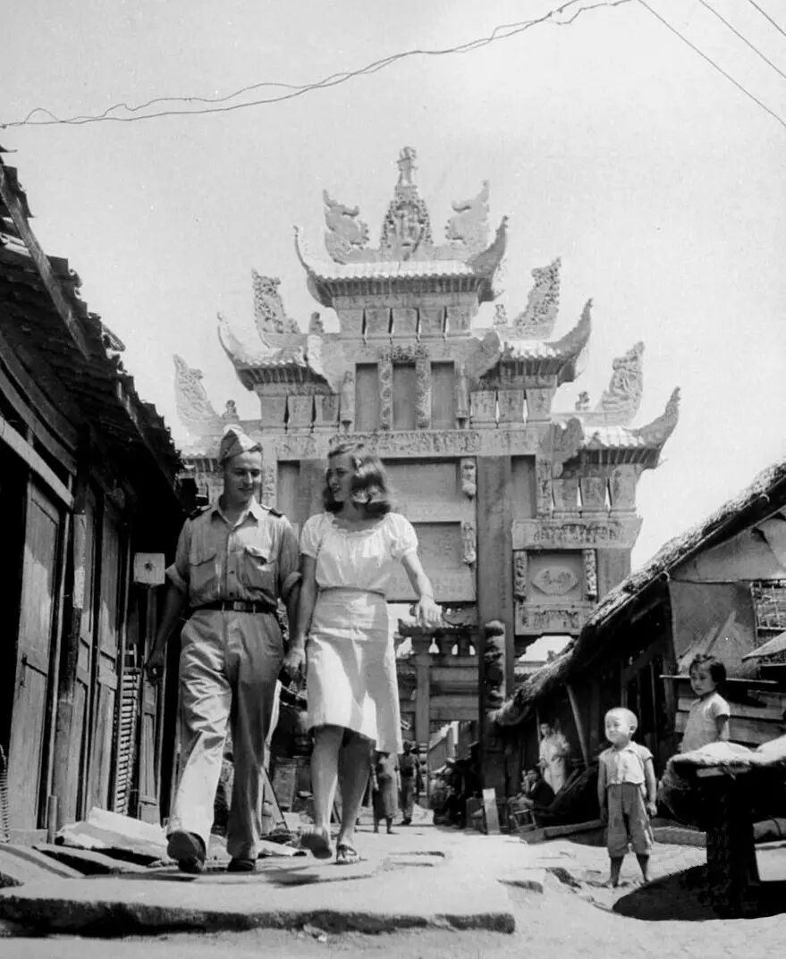 1945年10月,重庆,战地记者帕霍伊特和他的女友巴巴拉·斯蒂芬斯一起逛街。杰克·威尔克斯/摄。