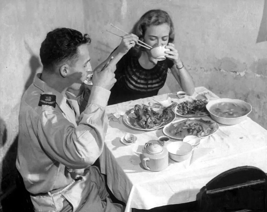 1945年10月,重庆,帕霍伊特和女友用筷子享受中国美食。杰克·威尔克斯/摄。