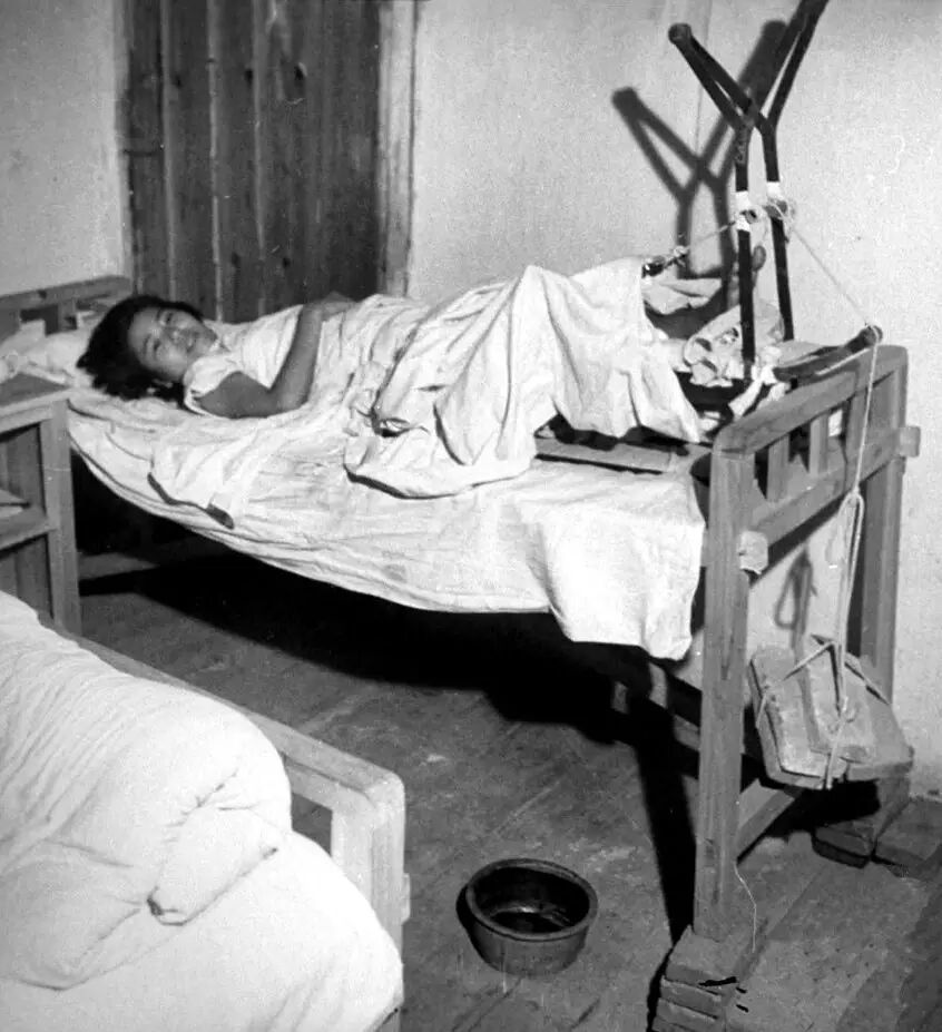 1945年,广西柳州,被军队卡车辗断腿的病人在医院里接受救治。杰克·威尔克斯/摄。