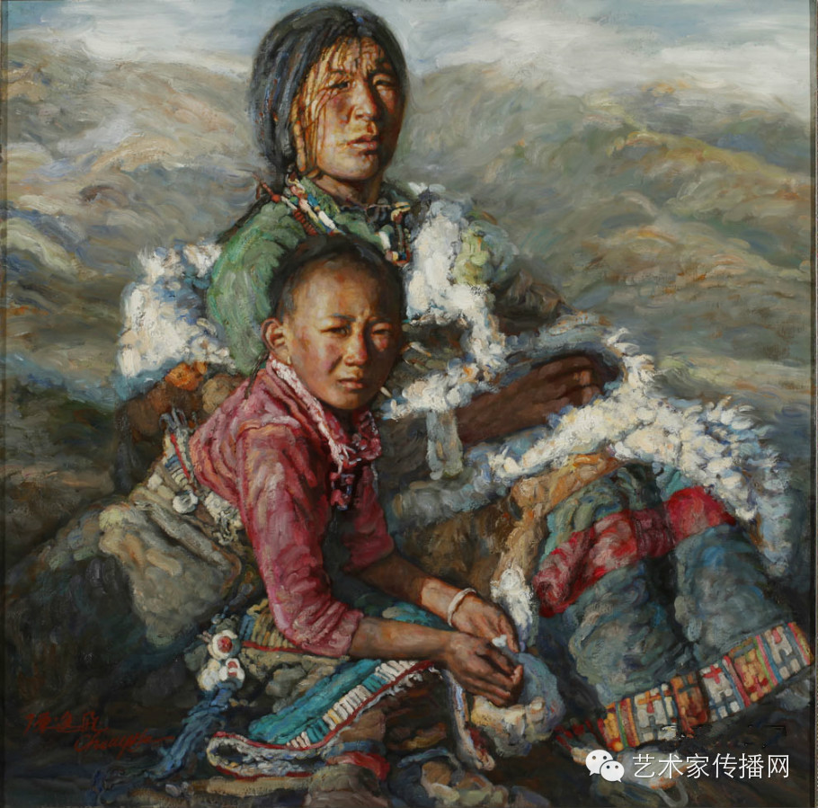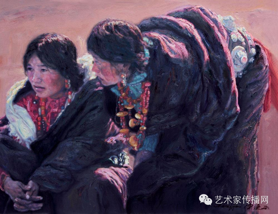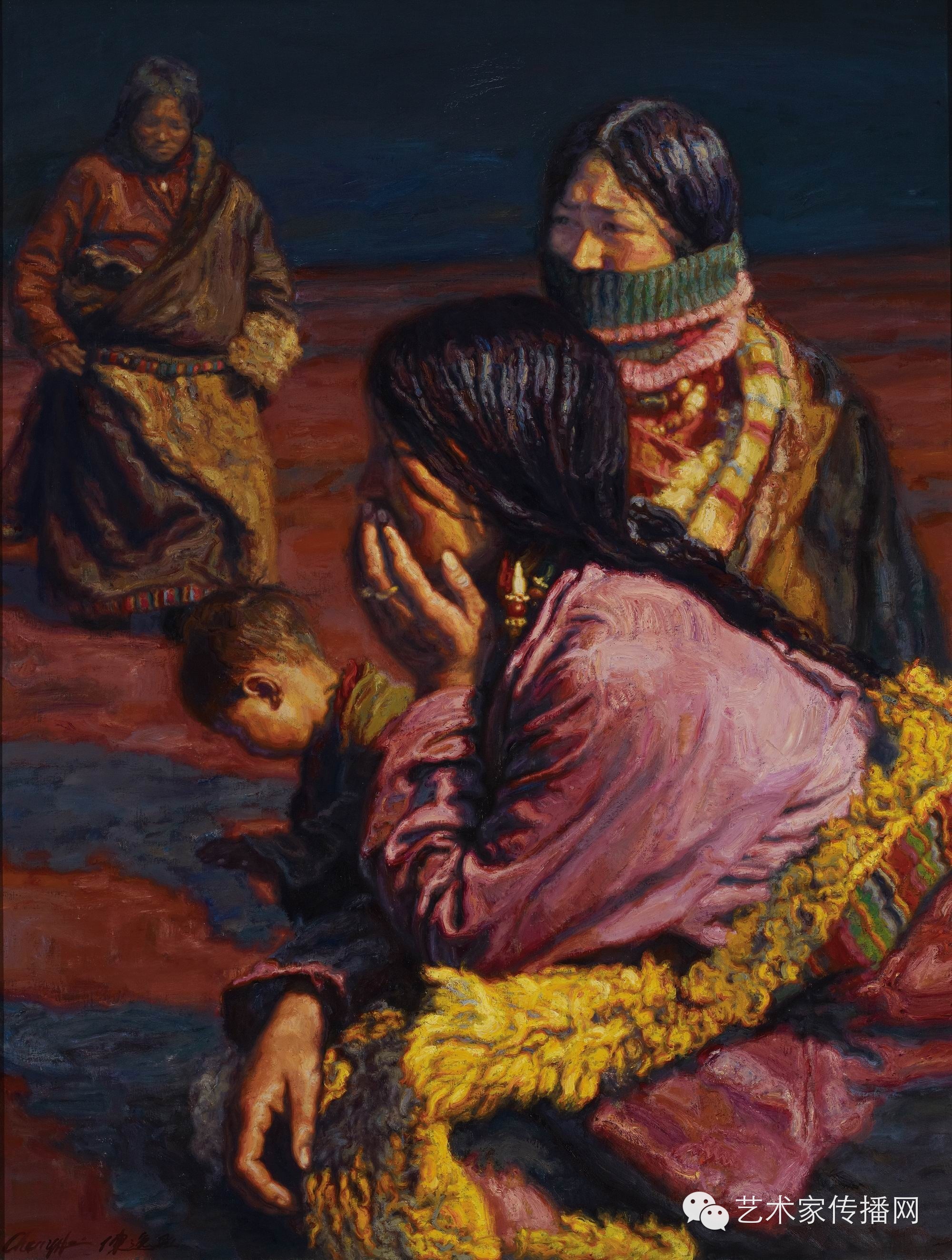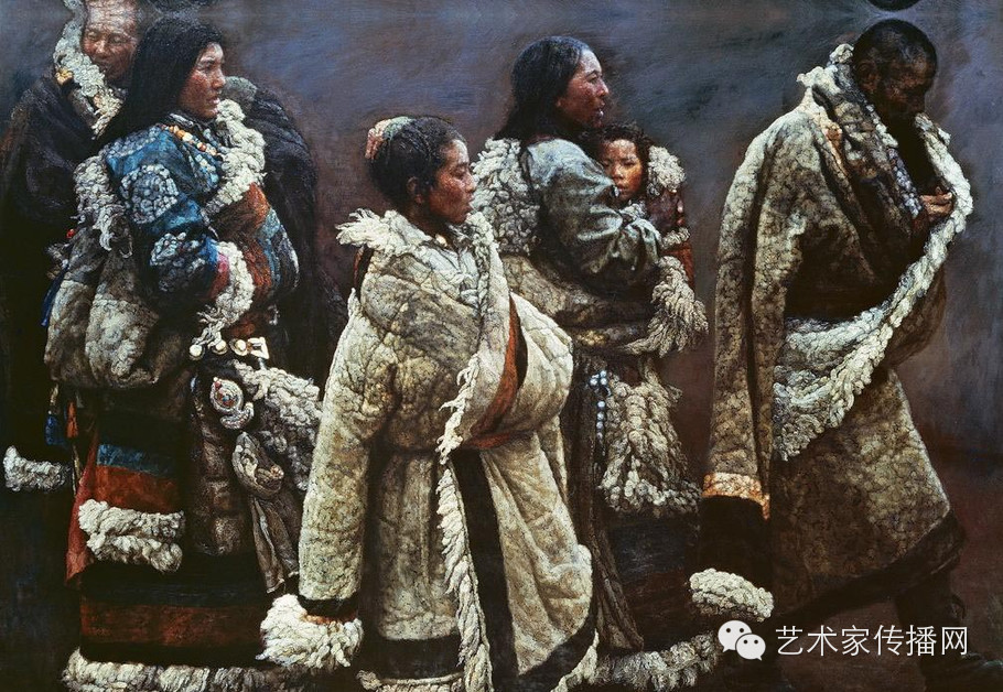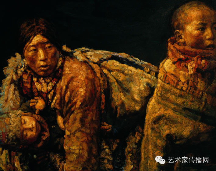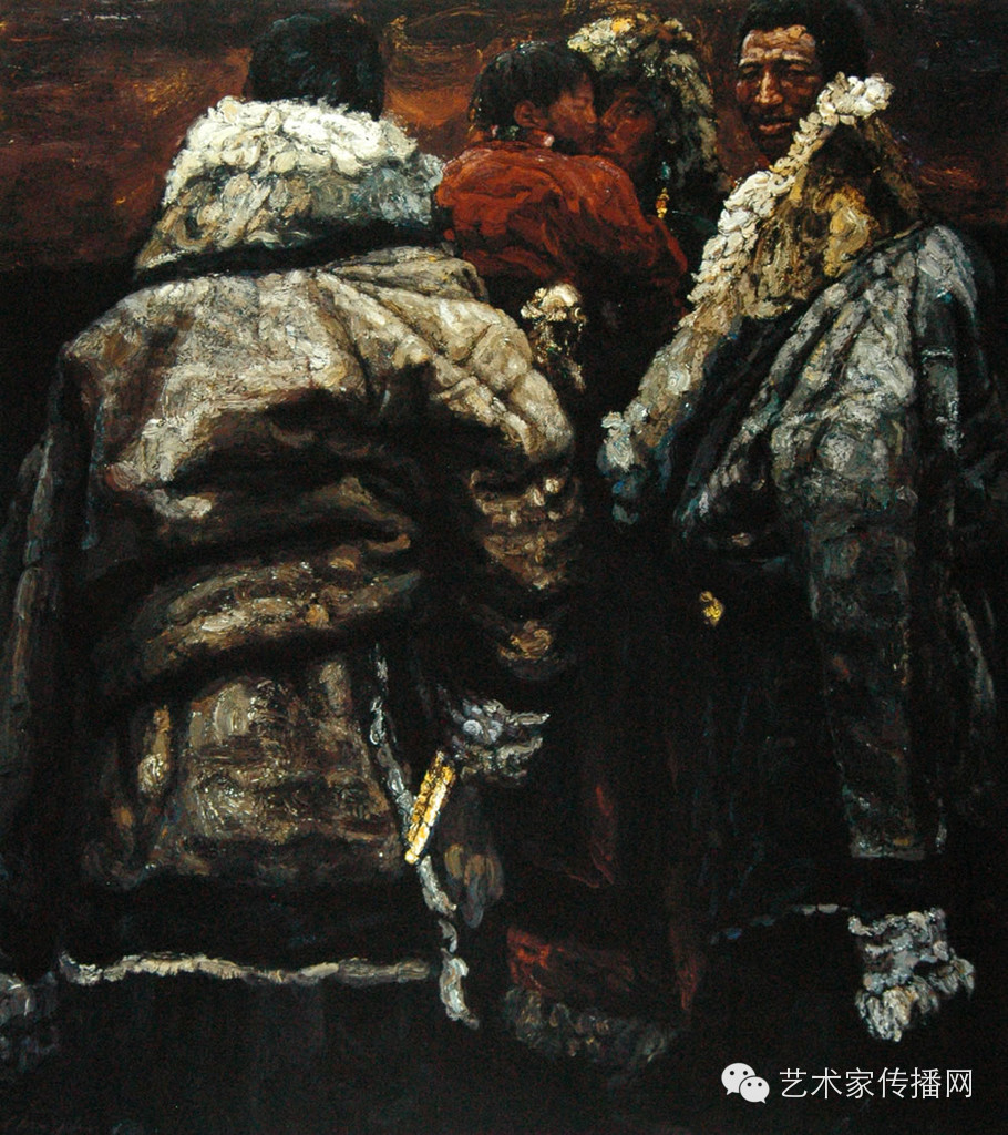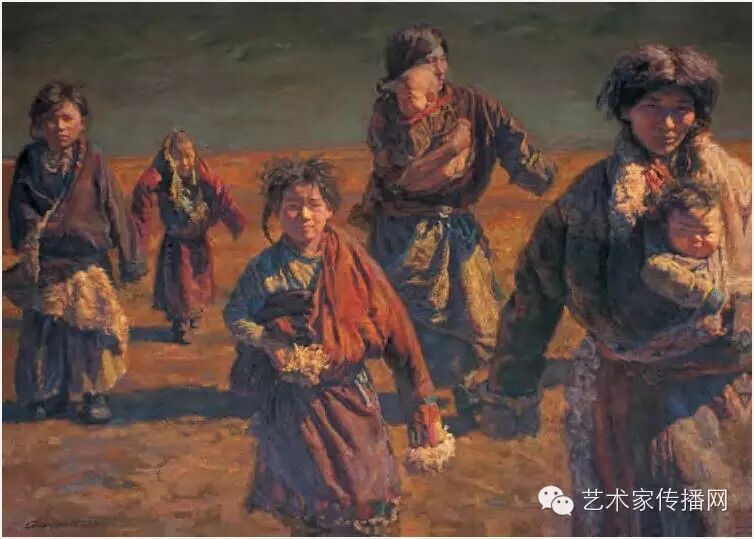 陈逸飞创作了一系列以西藏民俗为主题的油画,刻意凸显藏民的粗犷、原始、神秘。用奇异的民俗去演绎古老中国的浪漫故事以唤起西方对东方的无限想象。看他的《晨曦》( 1995)、《山地风》( 1994)、《藏族人家》( 1995)、《山人(1996)、《神庙》( 1995) 等。这些作品虽然在风格上一反他此前作品的柔谧甜美、细腻精致,趋于粗犷豪迈、浑厚壮美; 在形式上显示出圆满的技艺、老练的笔触、新颖的构图; 在色彩上表现出辉煌的戏剧性的对比效果。