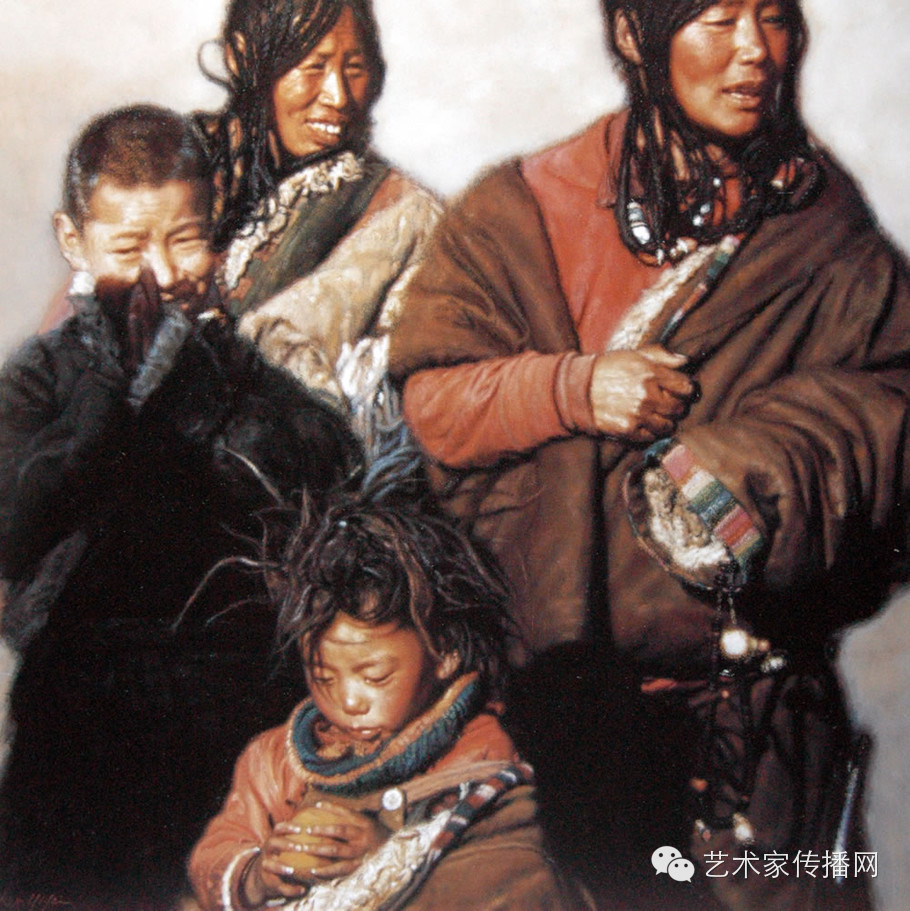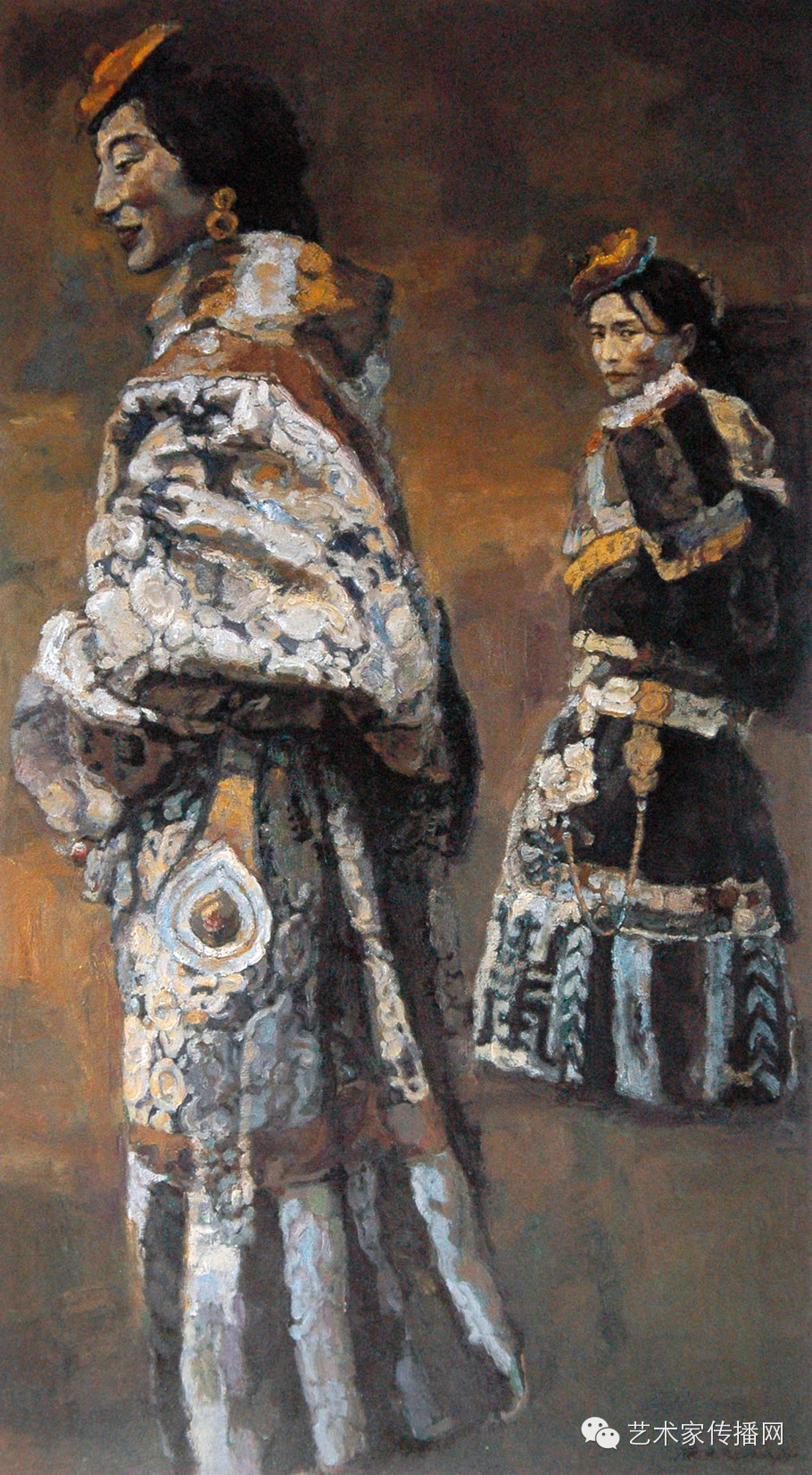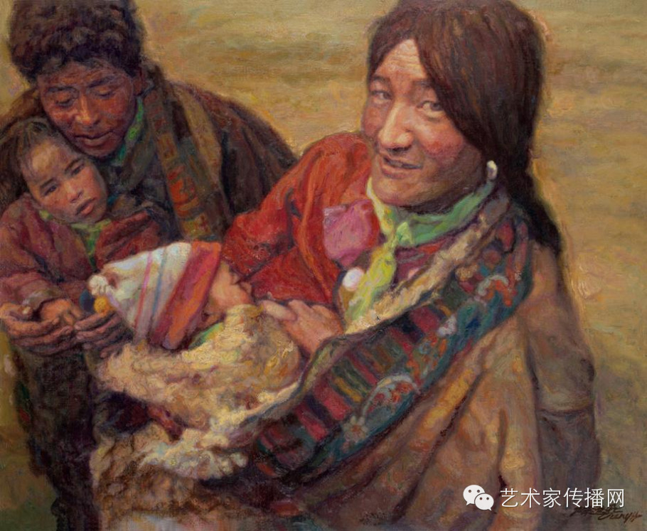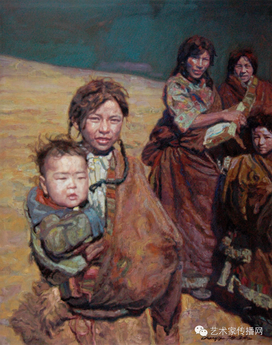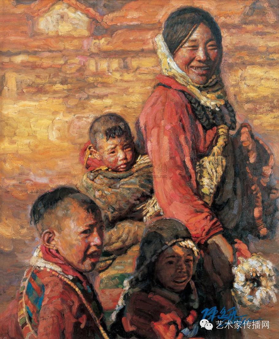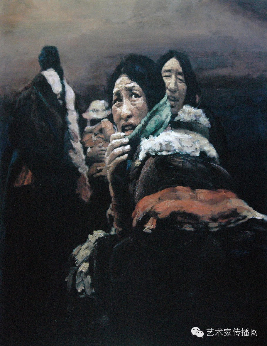 陈逸飞创作了一系列以西藏民俗为主题的油画,刻意凸显藏民的粗犷、原始、神秘。用奇异的民俗去演绎古老中国的浪漫故事以唤起西方对东方的无限想象。看他的《晨曦》( 1995)、《山地风》( 1994)、《藏族人家》( 1995)、《山人(1996)、《神庙》( 1995) 等。这些作品虽然在风格上一反他此前作品的柔谧甜美、细腻精致,趋于粗犷豪迈、浑厚壮美; 在形式上显示出圆满的技艺、老练的笔触、新颖的构图; 在色彩上表现出辉煌的戏剧性的对比效果。